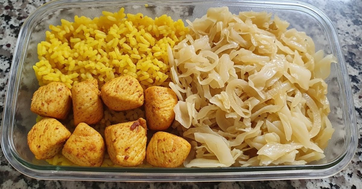 3. Arroz com cúrcuma + Frango em cubos + Repolho refogado