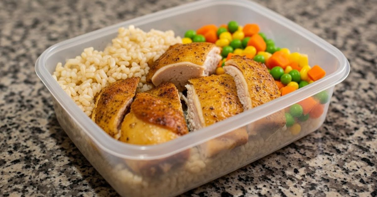 Cozinhar frango em maior quantidade e congelar porções facilita montar marmitas rápidas.