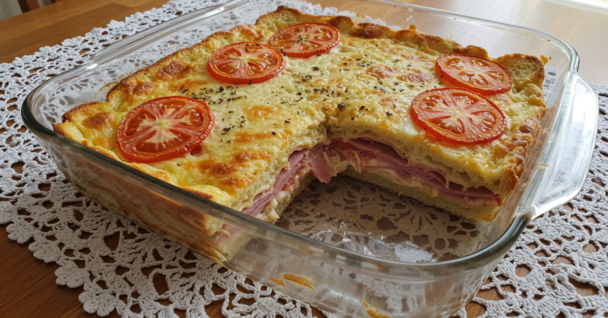 Com camadas de pão, presunto, queijo e um creme por cima, ela fica douradinha e super cremosa por dentro.
