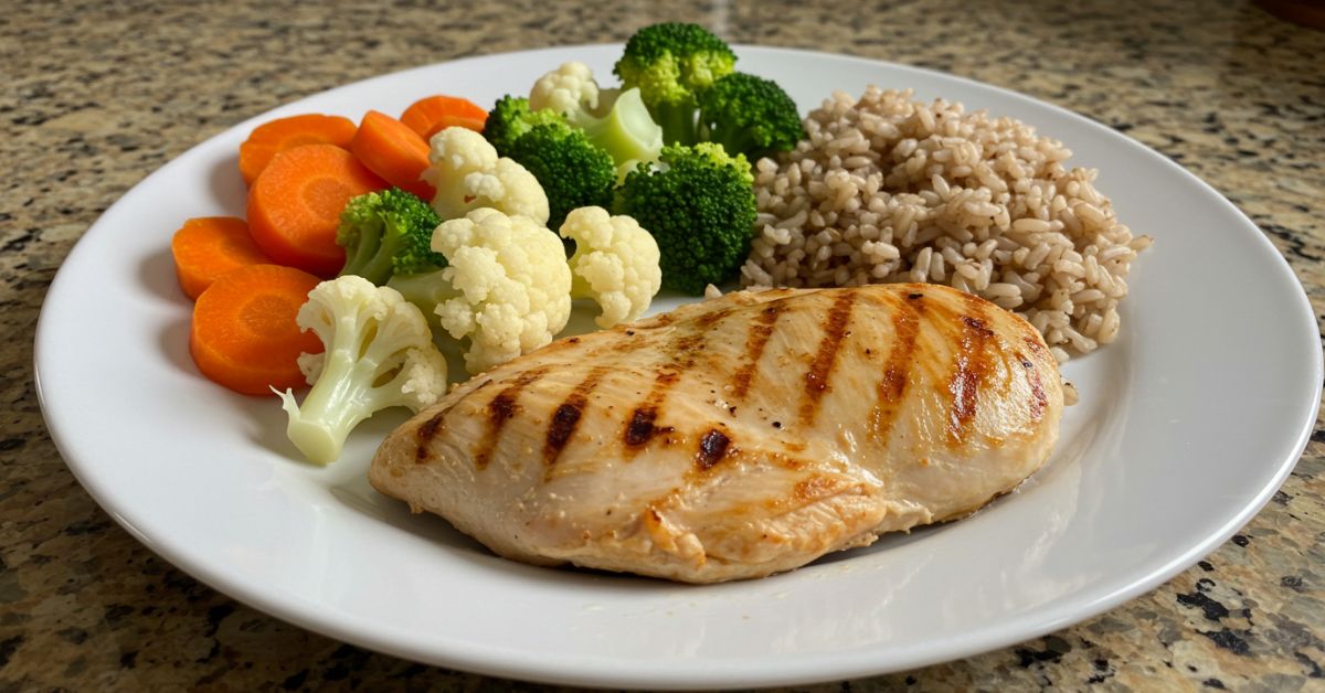 🍗 2. Frango Grelhado com Arroz Integral e Legumes no Vapor