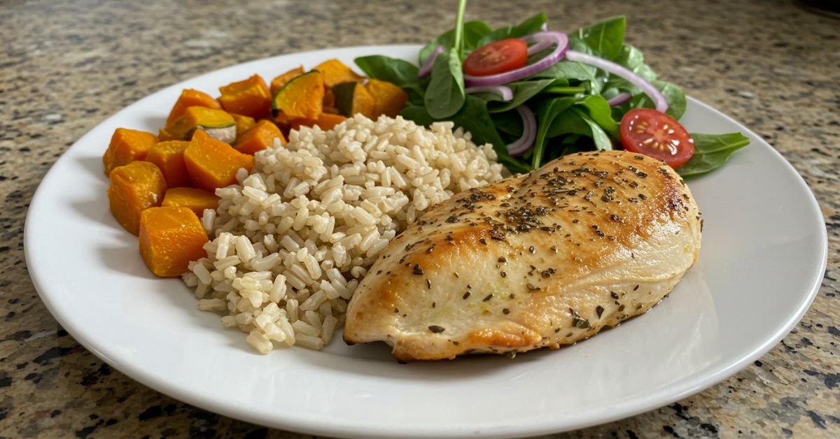 🍗 5. Peito de Frango Assado com Arroz Integral, Legumes e Salada
