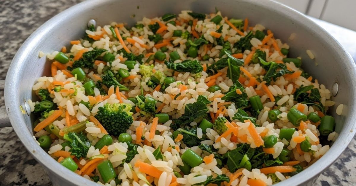 Refogue o alho no óleo. Acrescente o arroz e mexa bem. Junte a cenoura, a vagem e o brócolis. Cubra com água quente, coloque o sal e cozinhe normalmente. Quando estiver quase seco, misture a couve, tampe a panela e finalize o cozimento.